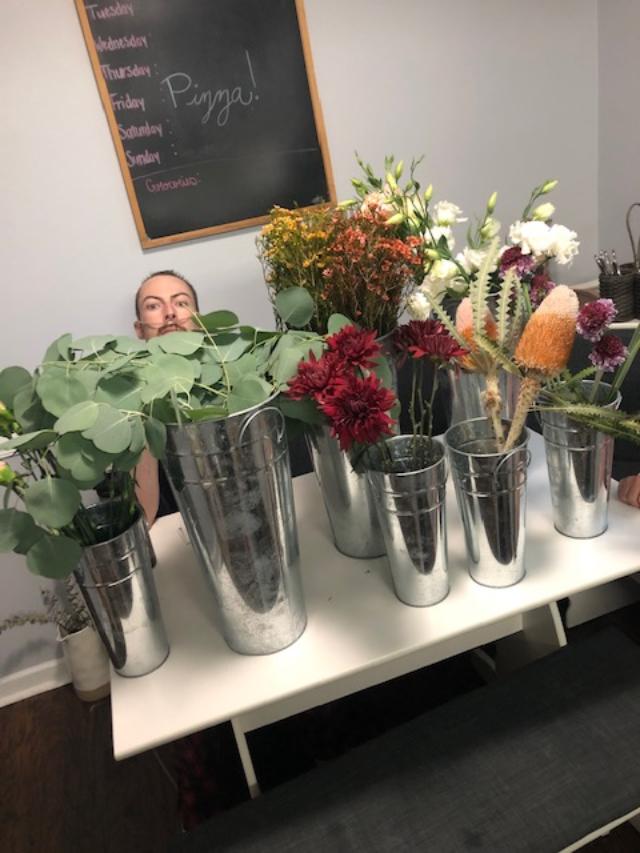 You see, my husband actually liked flowers. In his life, he had preferences, and I could only assume that in his death, he had the same. He had just sat there two months before with our friend Gabriella as she taught us how to arrange flowers, and he knew what he liked. He liked the goofy billy-balls, the green and fragrant eucalyptus, the glossy look of the wax flowers.