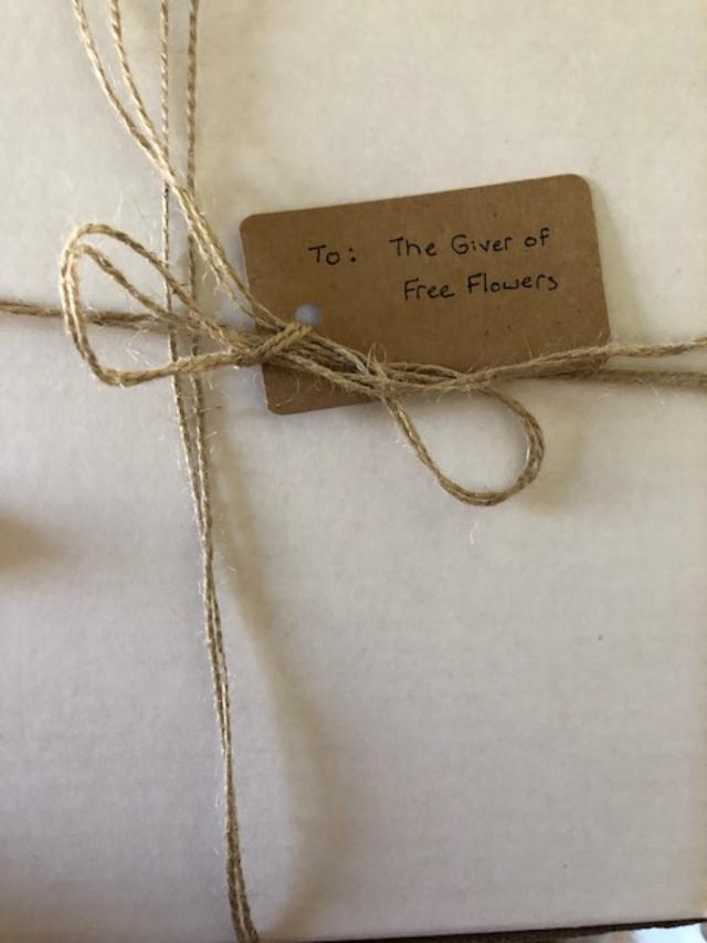 It was about two weeks later that I found the box on my front porch. On it, a tag that read, “To the giver of free flowers.”
